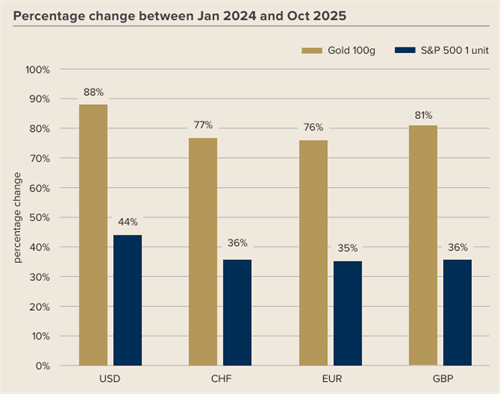 A case study can be made by imagining an investor purchased 100 grams of gold, priced at around $6,600 on 2 January 2024, and one unit of the S&P 500 Index, priced at around $4,700 on the same day. Fast forward to 2 October 2025, and the 100 grams of gold is now worth $12,434, a staggering 88% increase. Over the same period, the Index rose to $6,772 per unit, a respectable 44% increase, but one which nevertheless falls short of goldʼs performance. In Europe, the gold price for 100 grams jumped from CHF 5,600 to CHF 9,896, from €6,000 to €10,580 and from £5,100 to £9,212. These price movements represent a 77% increase in Swiss francs, a 76% increase in euros, and an 81% increase in British pounds.