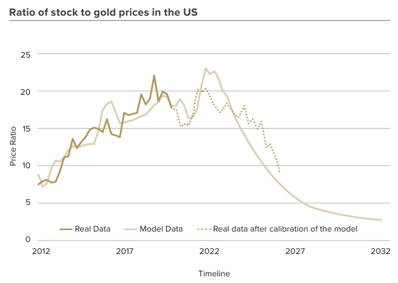According to the model, the peak at which economic activity assets (such as equities) will outperform gold is around Q3 2022. From that point forward, the model predicts an outperformance of gold relative to stocks (light line). When compared to real data on the stock-to-gold price ratio (dotted line), the trend of gold outperforming stocks appears to have begun early in 2022. Whether a short-term reversal will occur remains uncertain; however, the long-term trend towards stronger gold performance remains evident.