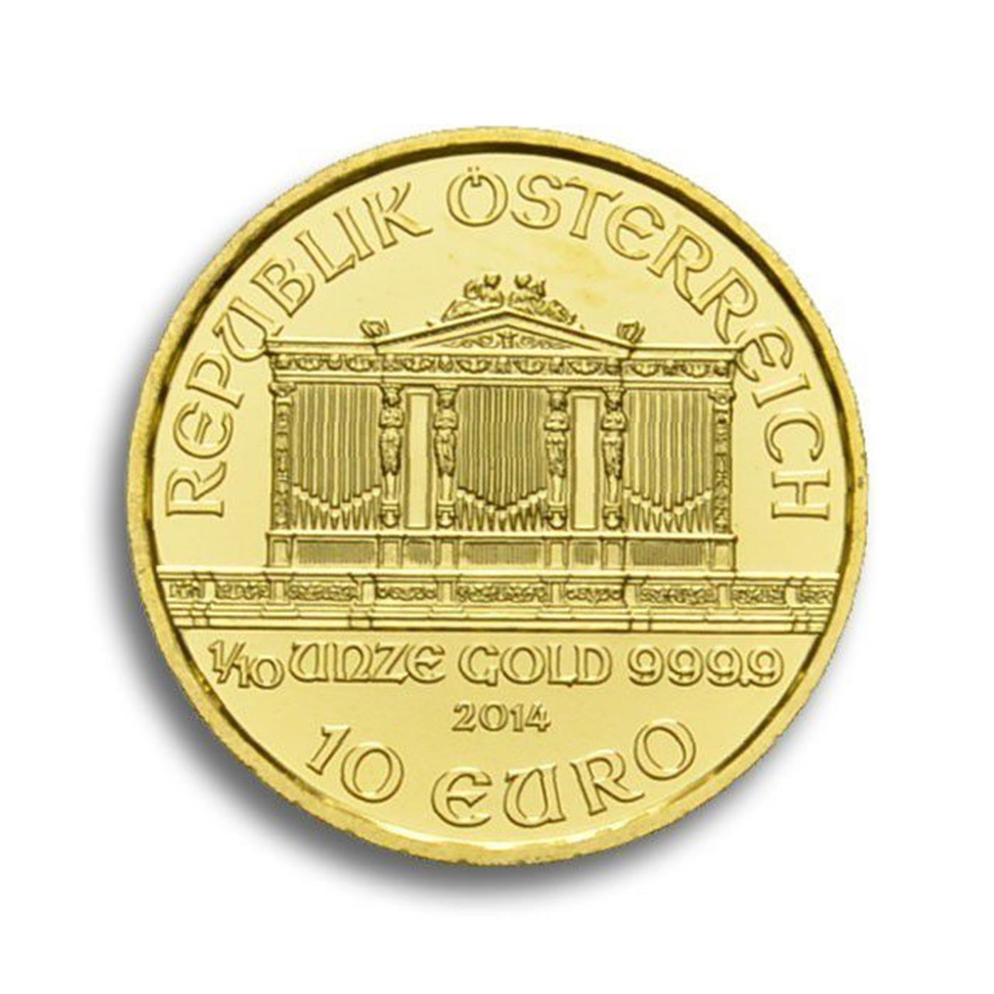 The 1/10oz Philharmonic Gold Coin is known for its classic design of the Musikverein with its array of instruments such as the four violins centered on a cello, french horn, harp and bassoon.